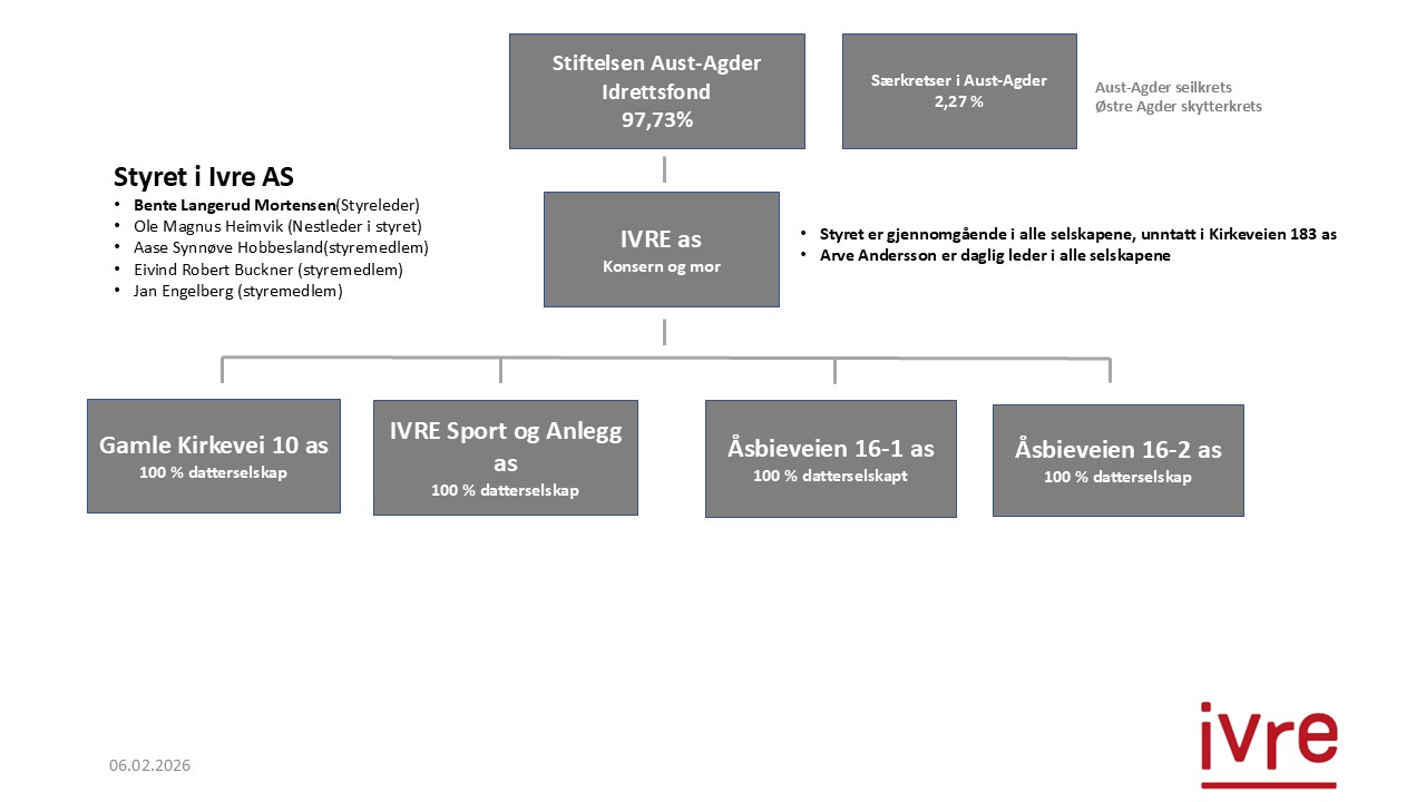 Ivre as har en videre en konserndel som driver fellestjenester for alle selskapene, samt eiendomsforvaltning og utvikling. Styret i Ivre består av 5 personer og rapporterer til eierne, Idrettsfondet og særkretsene i Aust-Agder (de tre særkretsene som er eiere).
